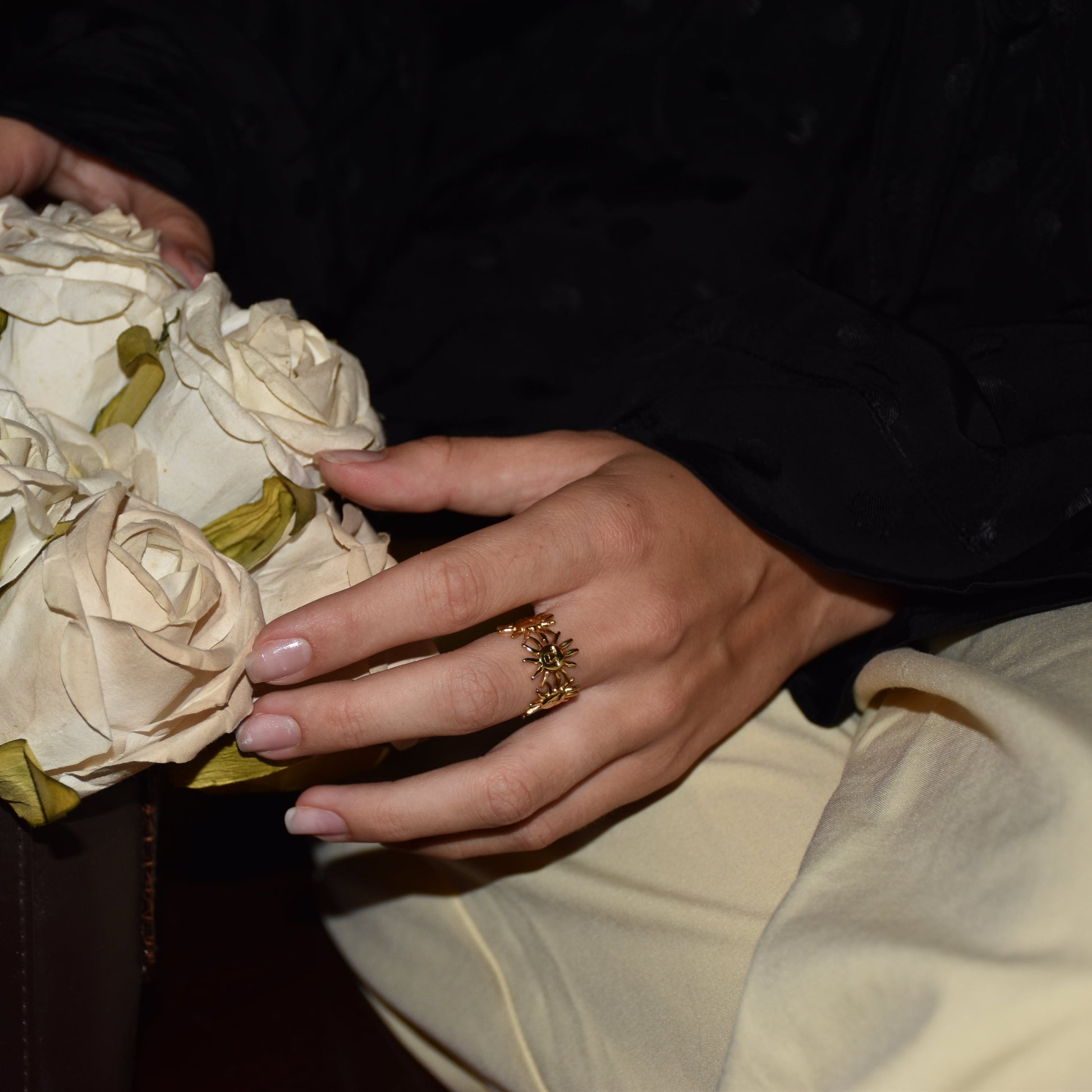 El Anillo Solete Dorado es un anillo ajustable de acero inoxidable diseñado para mujeres que buscan un toque moderno y versátil en su estilo diario.