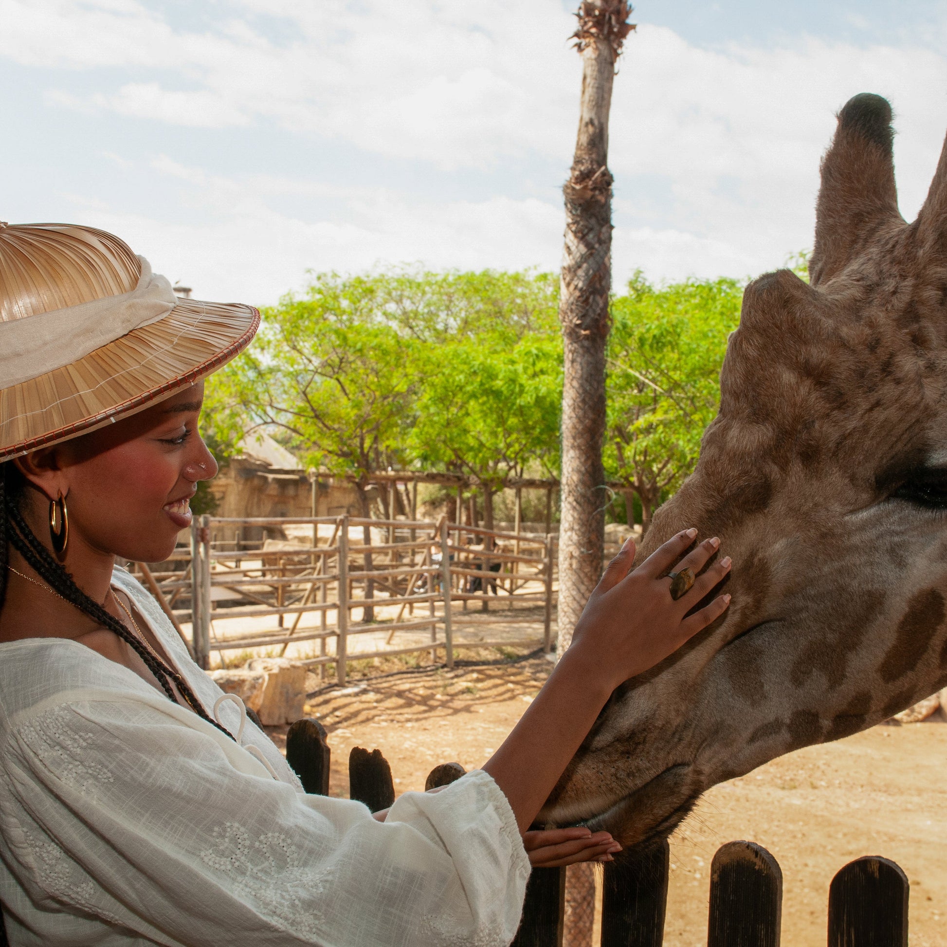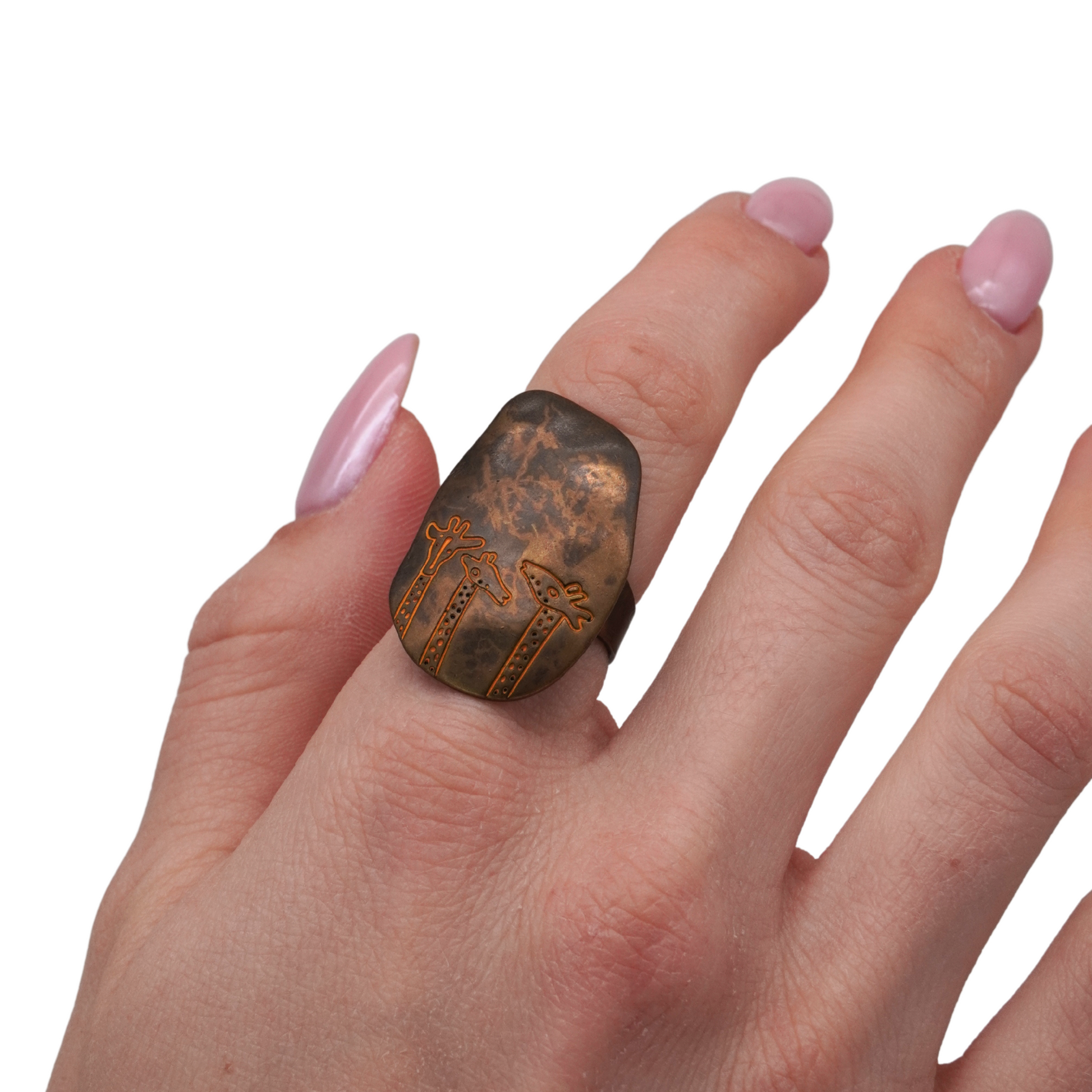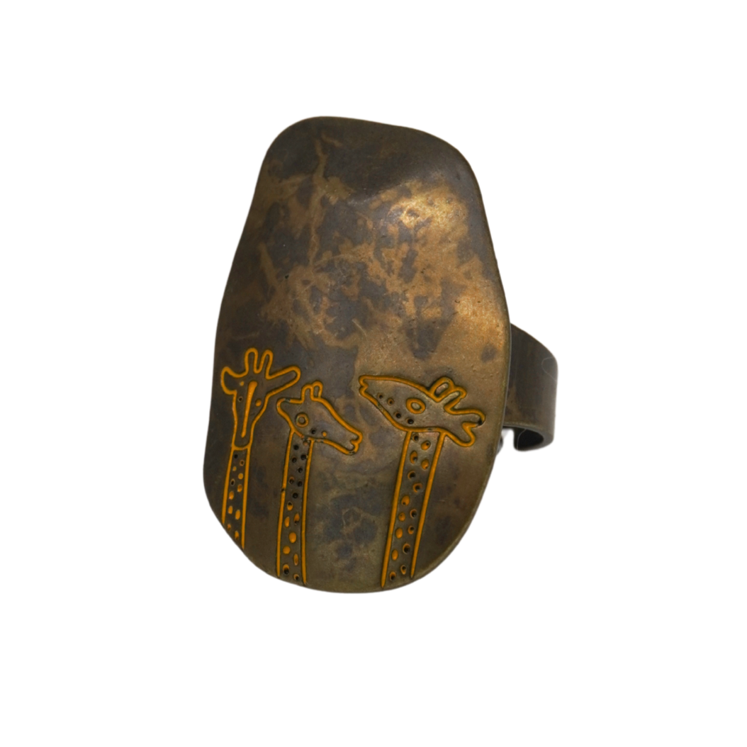 Con su acabado envejecido y la ilustración grabada de tres jirafas —símbolo de elegancia, altura y sabiduría africana— esta pieza tiene alma propia. Su diseño irregular y orgánico, trabajado en aleación de zinc, hierro y resina epoxy, le da un carácter artesanal, auténtico y único.