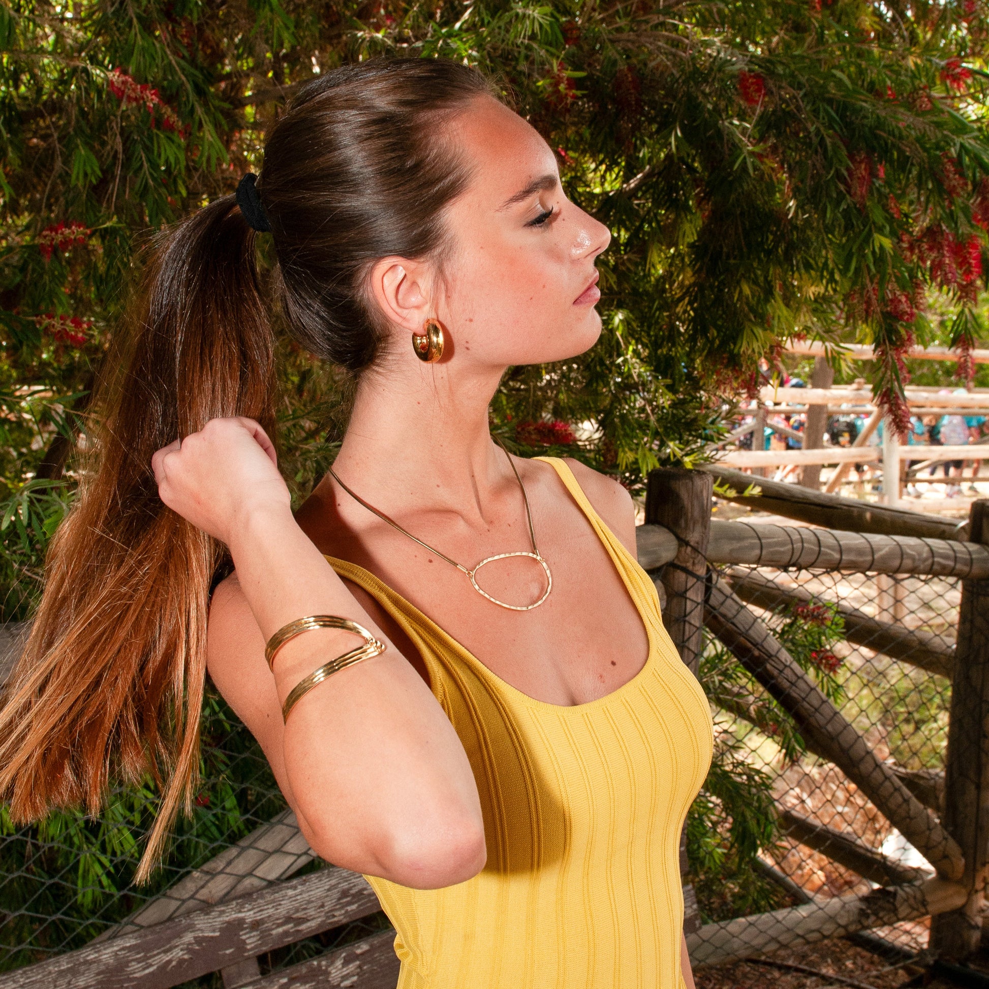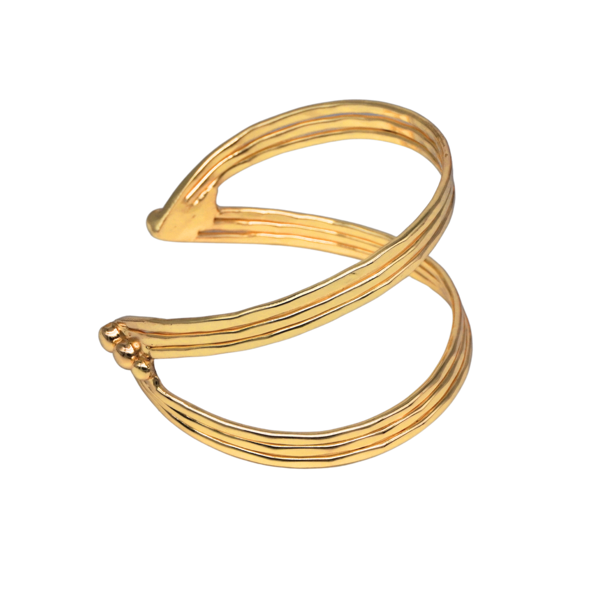 Diseñado para mujeres que aman lo distinto, el brazalete Kenia destaca por su estructura imponente y su diseño escultural. Fabricado en 100% latón con un acabado dorado luminoso, es una pieza que atrae miradas y eleva cualquier look al instante.