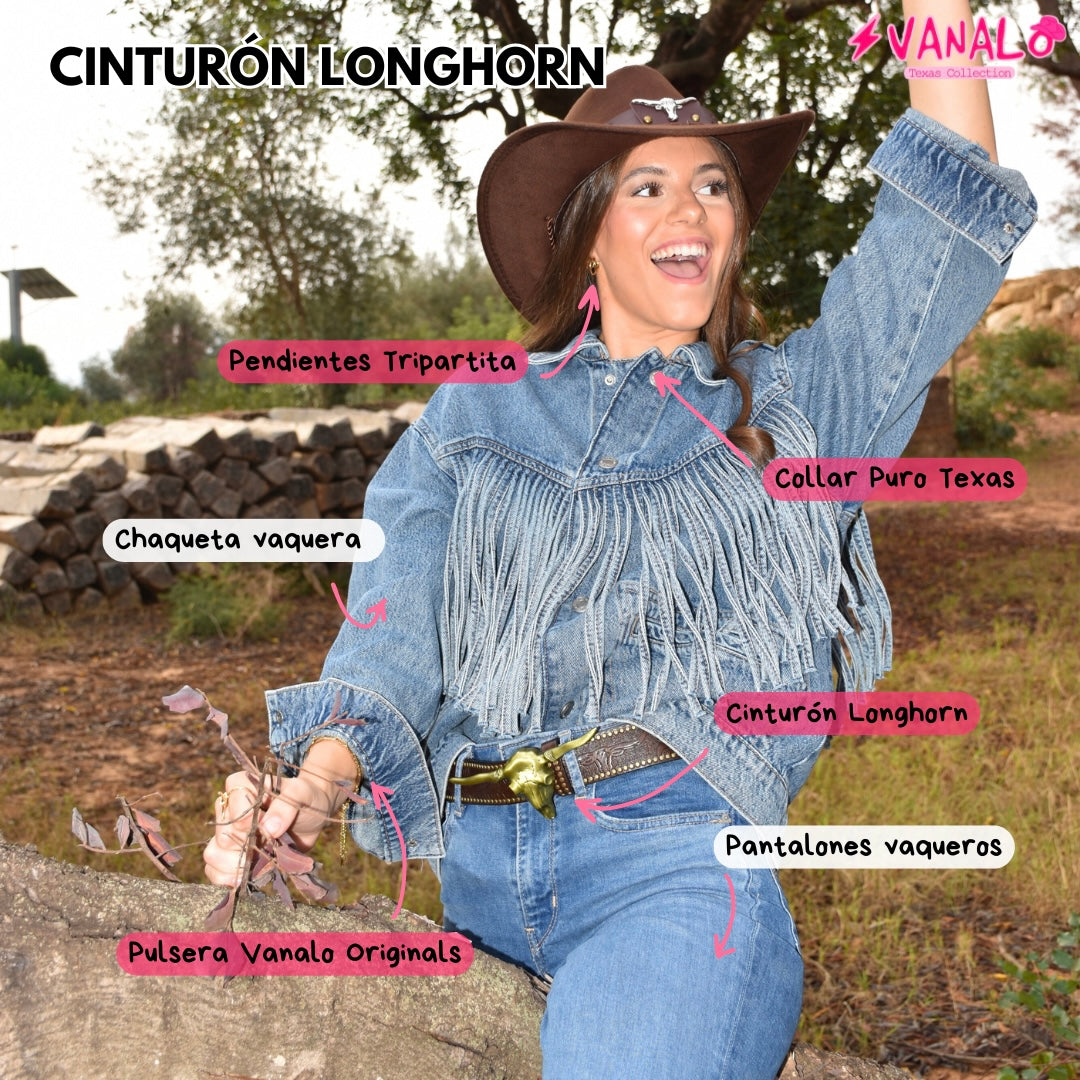 El Cinturón Long Horn con una hebilla en forma de cabeza de toro es la elección perfecta para quienes buscan un look auténtico y atrevido. Su diseño estilo cowboy, con detalles de tachuelas, captura la esencia del oeste y te transporta directamente a Texas.