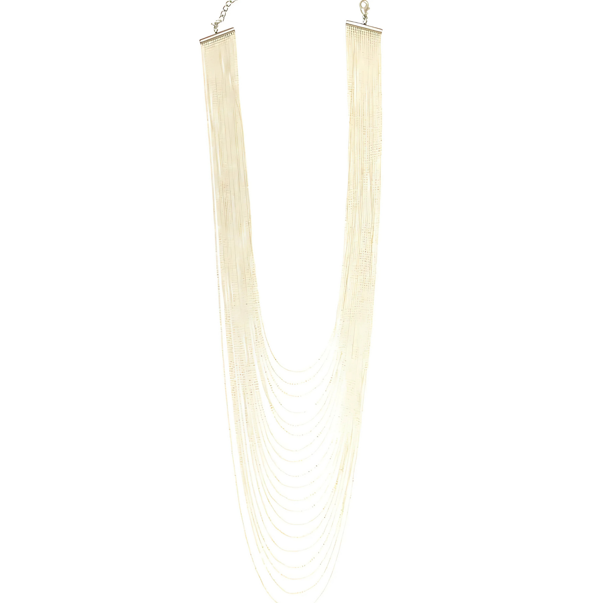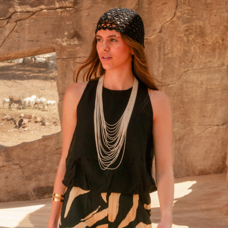 El Collar Diani es una cascada de líneas delicadas y movimiento sutil, inspirado en las playas infinitas de la costa keniana. Su diseño en múltiples hilos finísimos envuelve el cuello con luz y fluidez, creando una silueta que alarga, estiliza y cautiva.