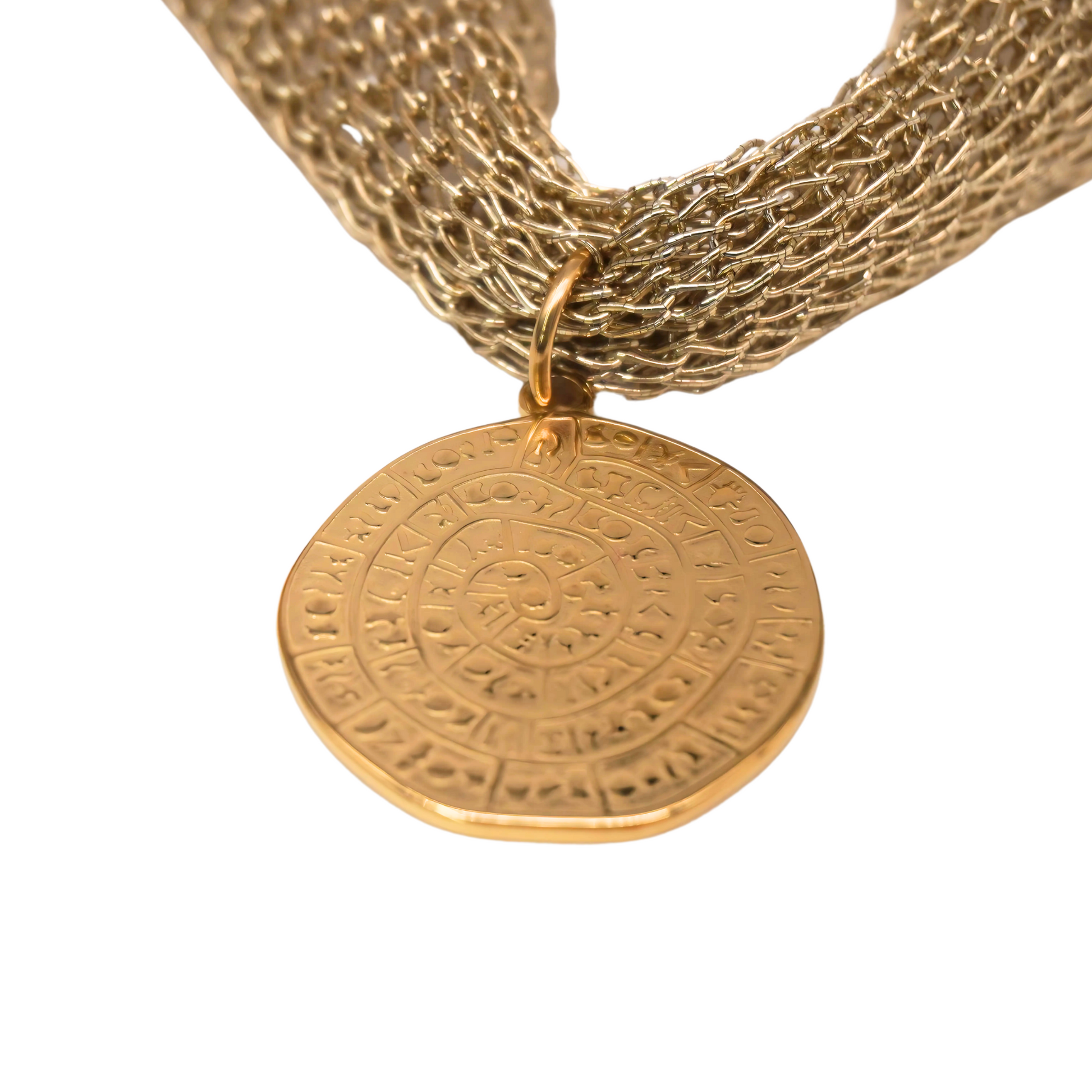 La cadena de malla, ligera pero con carácter, evoca las texturas orgánicas de un safari. Su brillo cálido captura la luz como la arena bajo los primeros rayos del día: suave, dorada, eterna.