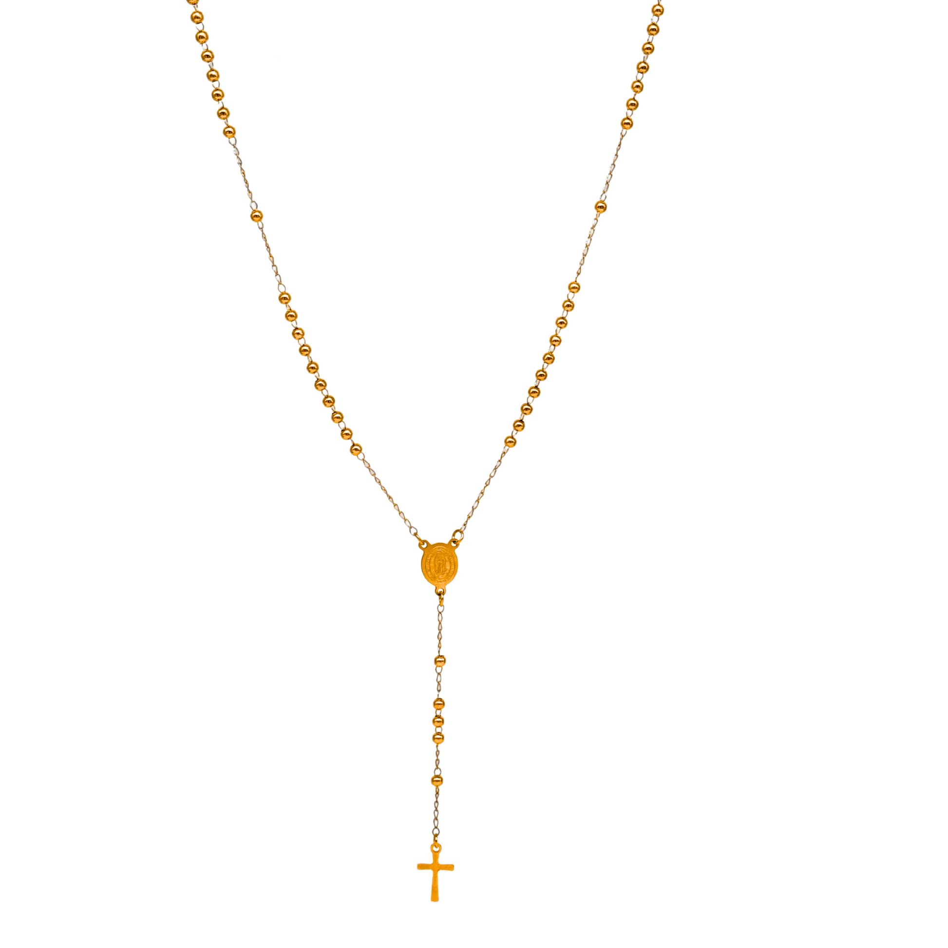 El Collar Mungu —que significa “Dios” en suajili— es una versión Vanalo del clásico rosario. Su diseño sutil y poderoso combina cuentas doradas con una cruz delicada y una medalla central, elaborado en acero inoxidable.