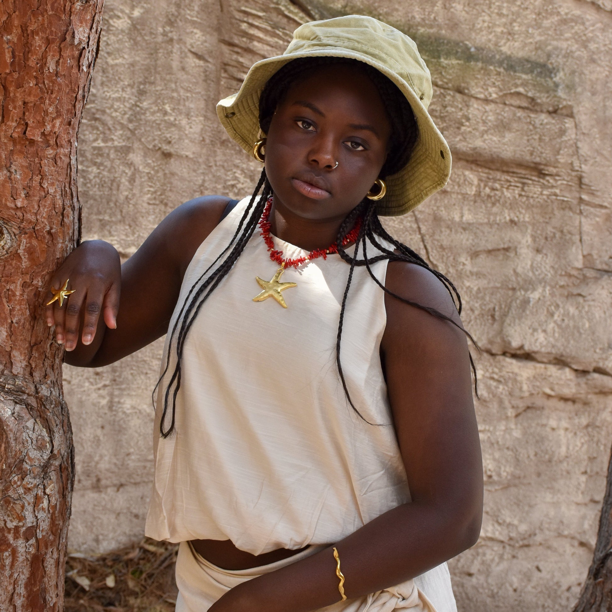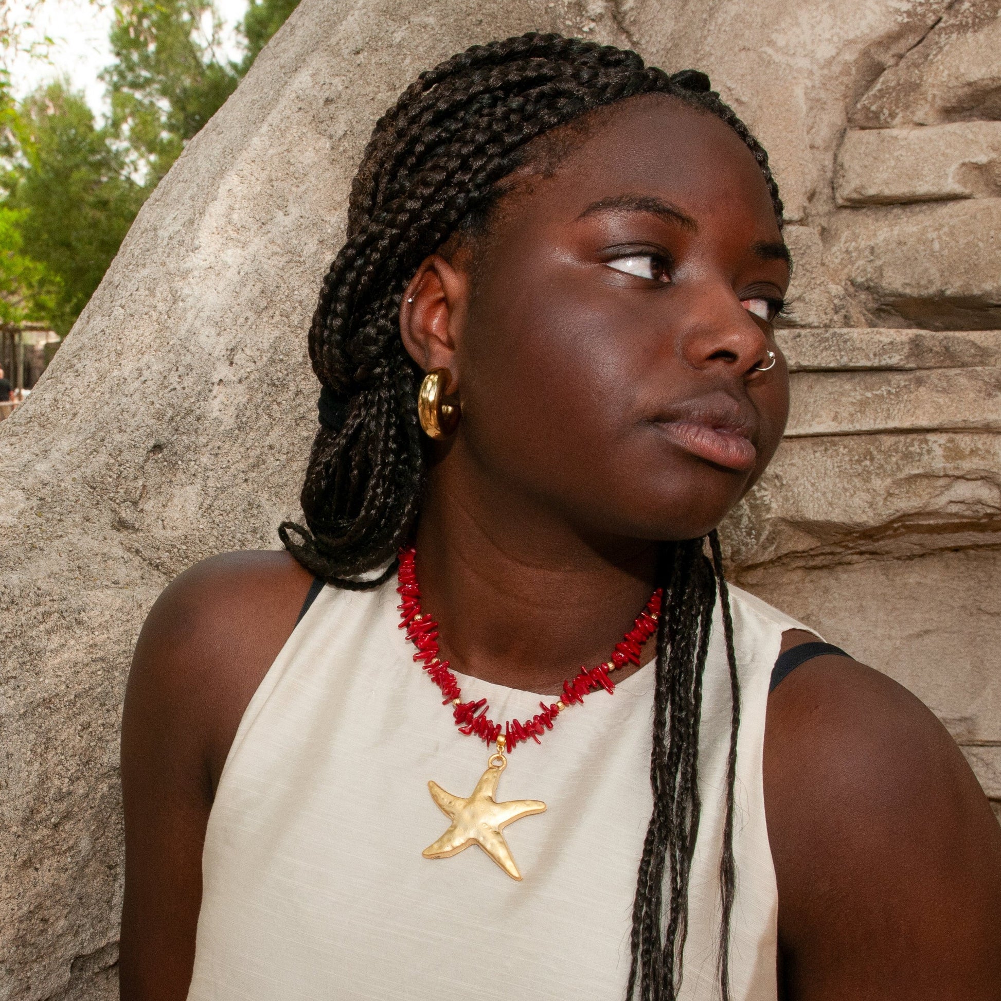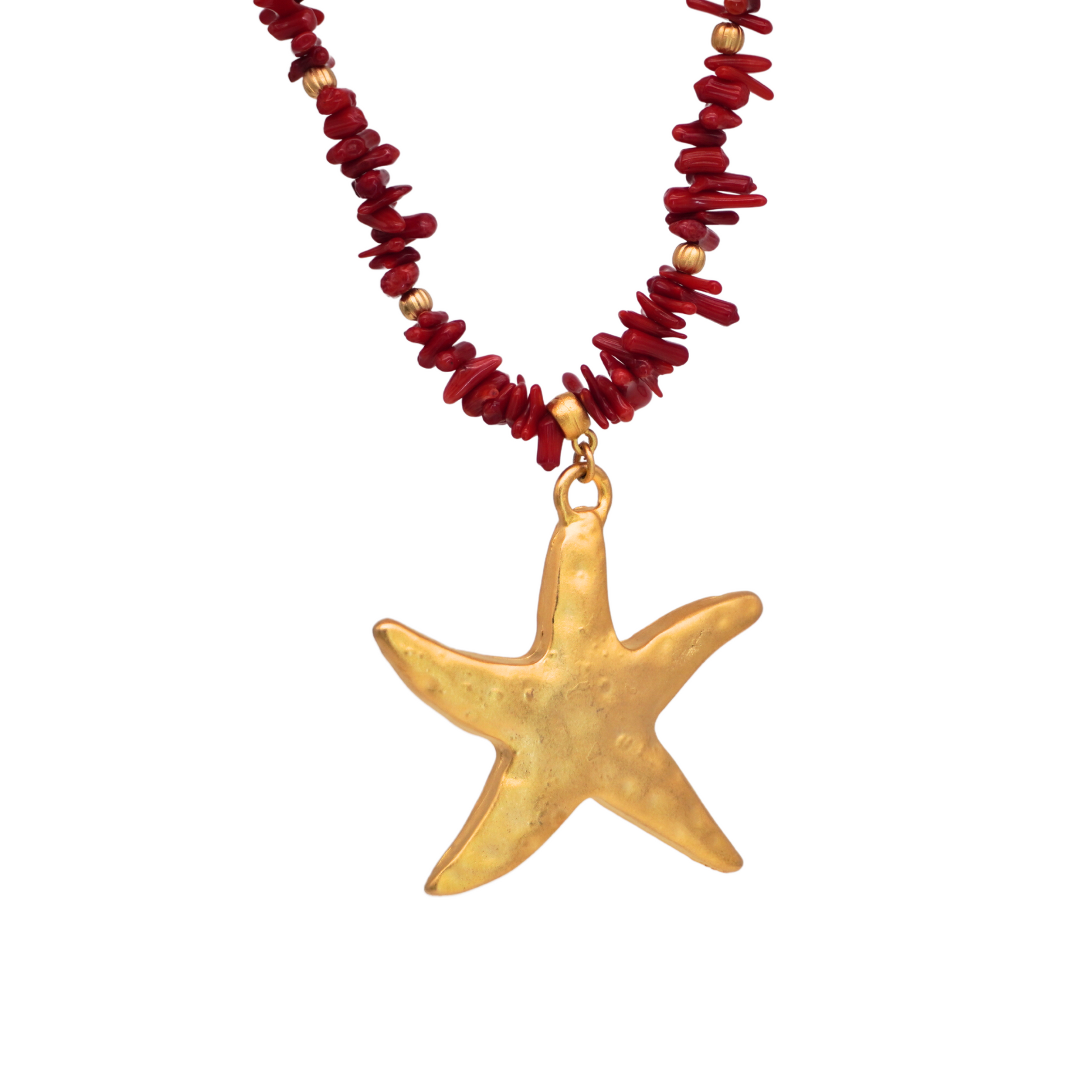 Confeccionado con coral natural rojo, transmite fuerza, pasión y un magnetismo natural. La estrella dorada, grande y con textura orgánica, representa la libertad, el mar y ese espíritu salvaje que despierta cuando el verano empieza. Diseñado por Patricia Vanalo, este collar es pura buena energía.