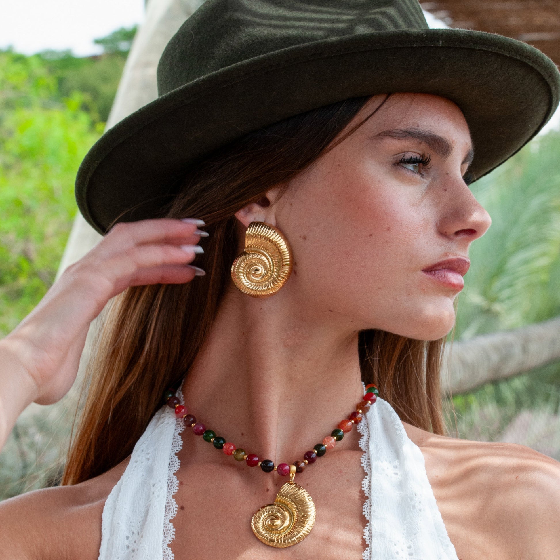 Estos pendientes son puro verano. Una pieza llamativa, dorada, con carácter, creada para chicas con alma de fiesta y estilo propio. Perfecto para combinar con el Collar Hacienda y el Anillo Hacienda para un look que grita: libertad, juventud y buen rollo.