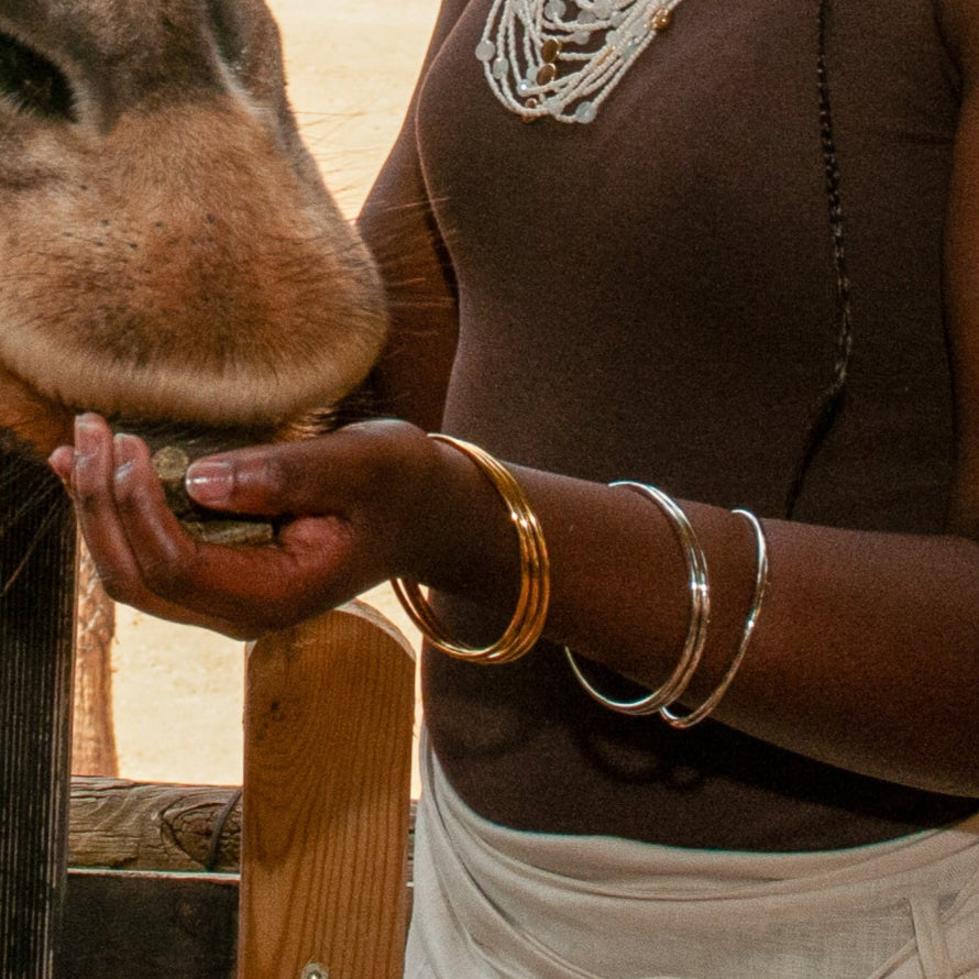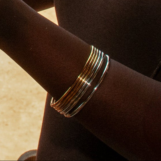 Las Maratatu —inspiradas en la palabra suajili para “tres veces”— son seis pulseras con doble identidad: llévalas sueltas en la muñeca para un look relajado, o deslízalas más arriba para transformarlas en un brazalete.